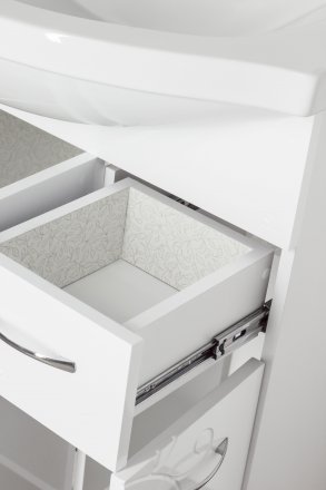 Тумба напольная бренда "Style Line" Эко Фьюжн 26 с 2 ящиками. Фурнитура - хром, тонкая элегантная декоративная фрезеровка фасадов. Направляющие полного выдвижения Hettich; эксклюзивный декор "Луино" - ламинация внутренней стороны изделия; сборка изделия с помощью эксцентриковых стяжек Hafele; все материалы полностью влагостойкие. Данная тумба предусматривает открытую подводку воды